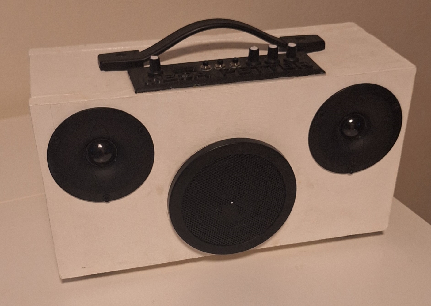 Min alldeles hemmabyggda blåtand-högtalare. Med digital ljudbehandling, play, pause, skip och visning av metadata. Med en ESP32 som mikrokontroller och signalprocessor tillsammans med en färdigköpt klass-D förstärkare. Allt förslutet i en hemmasnickrad låda med en simpel crossover-krets för högtalarelementen.